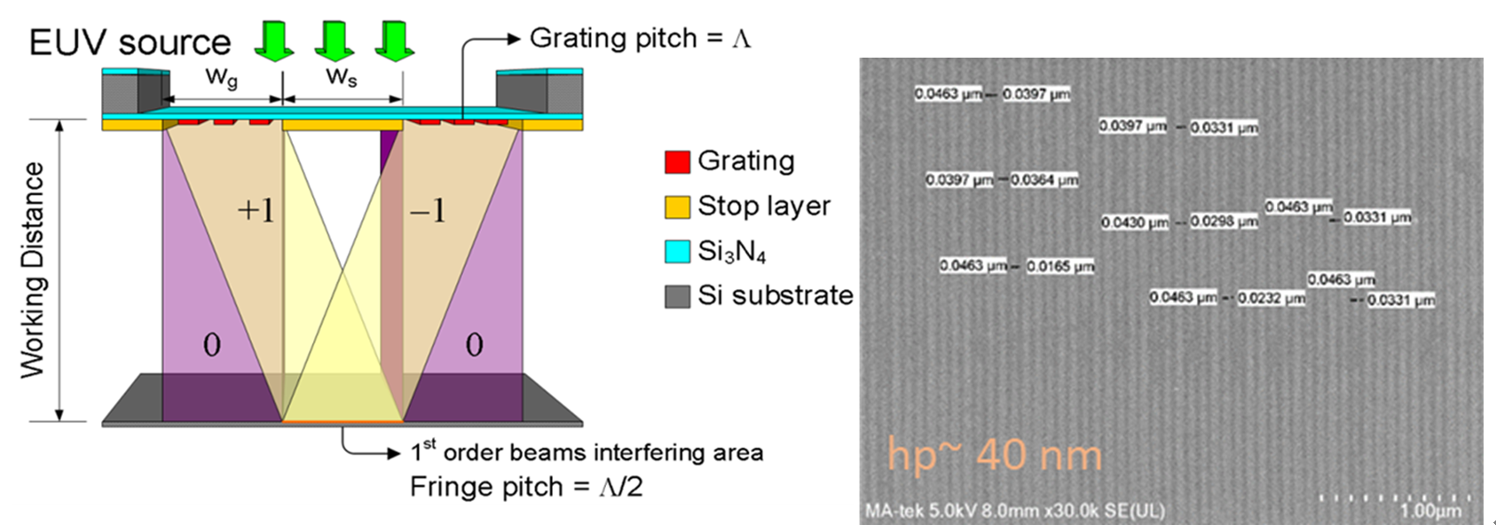 (左). EUV干涉微影示意圖, (右).利用 EUV干涉微影所得到的光阻圖形