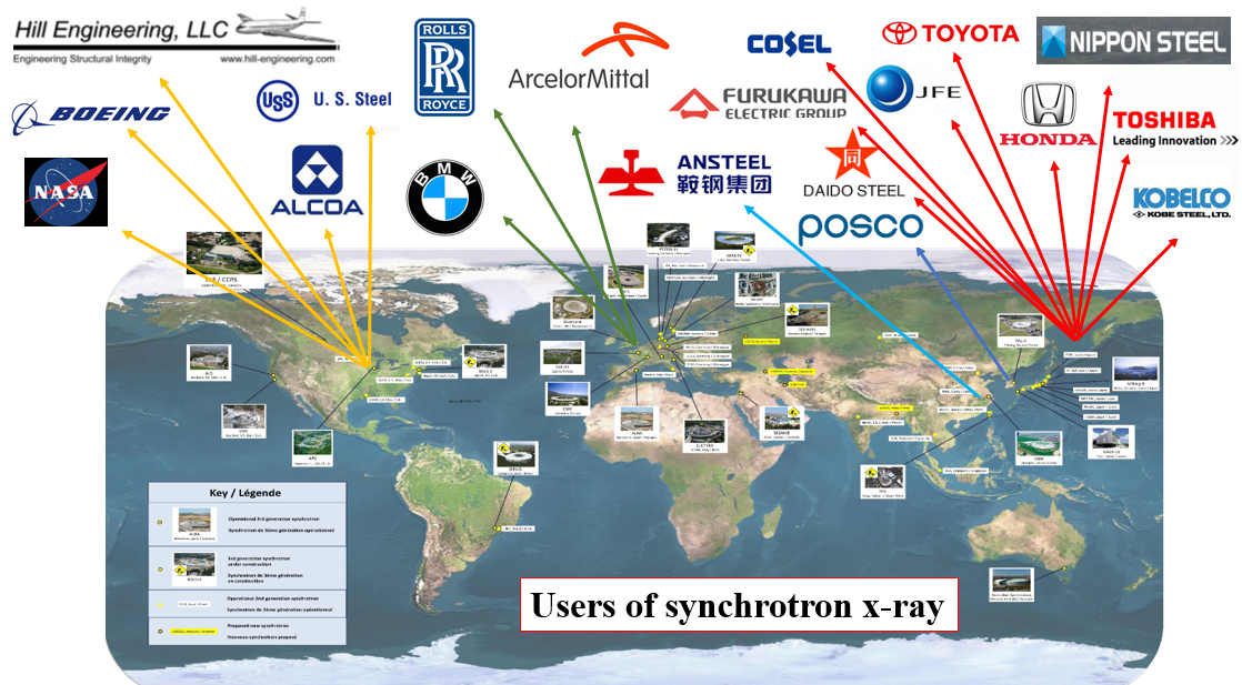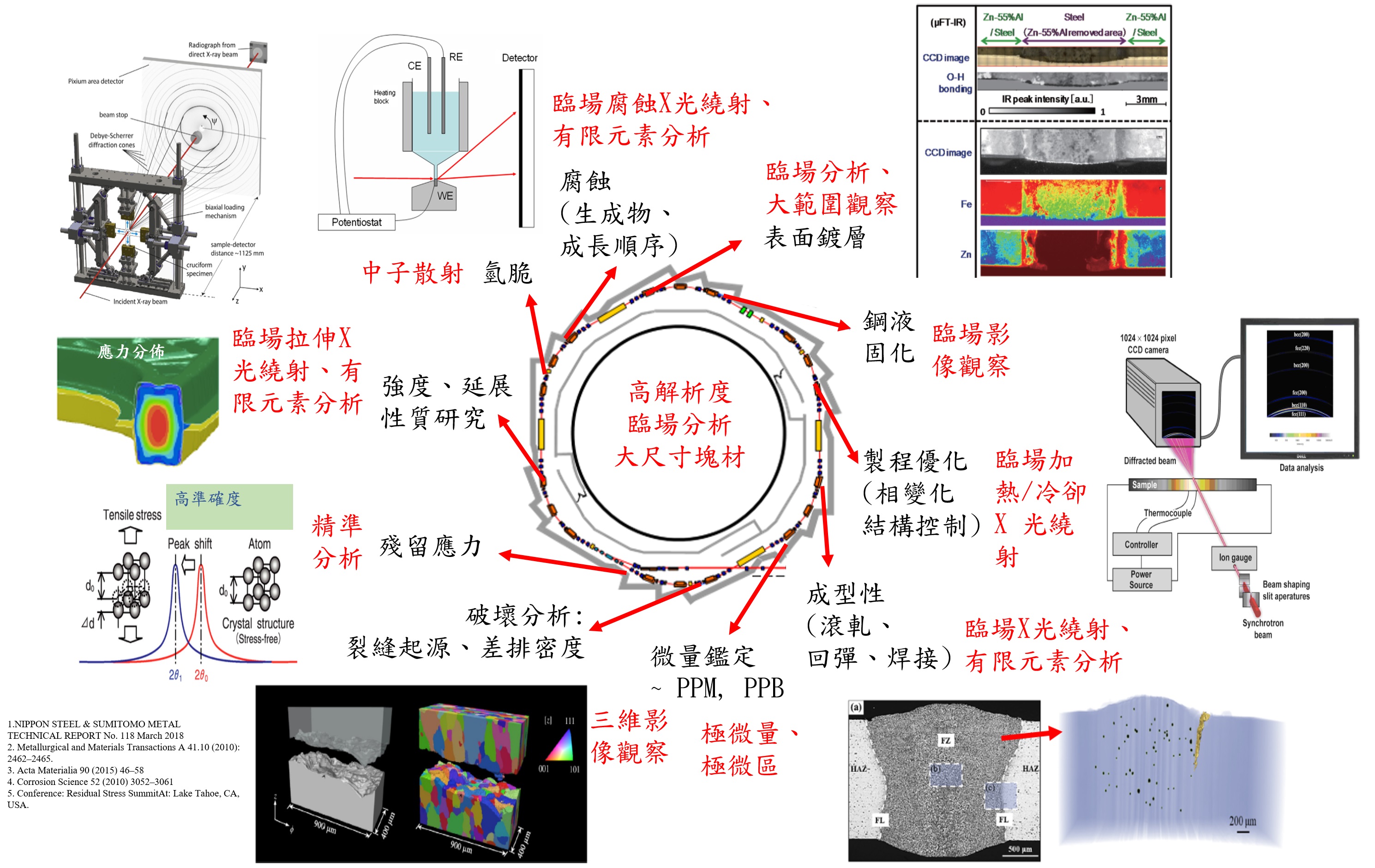 早在30年前,世界鋼鐵大廠 (例如日本製鐵、韓國浦項鋼鐵等)即開始進行同步輻射X光分析,從高爐熔煉、熱機加工到最後的機械性質鑑定,都有相當廣泛且深入的應用。既廣又深的應用,源自於同步輻射X光有相當高的解析能力,並且能進行一系列的臨場分析(臨場高溫、臨場拉伸/壓縮、臨場腐蝕等)。清楚呈現相變化、織構、微觀應變分佈、與殘留應力等資訊。對於新材料開發、最佳化製程研究、破壞防治與成型性研究,有相當大的幫助。借助國外成功經驗,同步輻射X光分析技術將能幫助國內鋼鐵廠商進行技術升級。