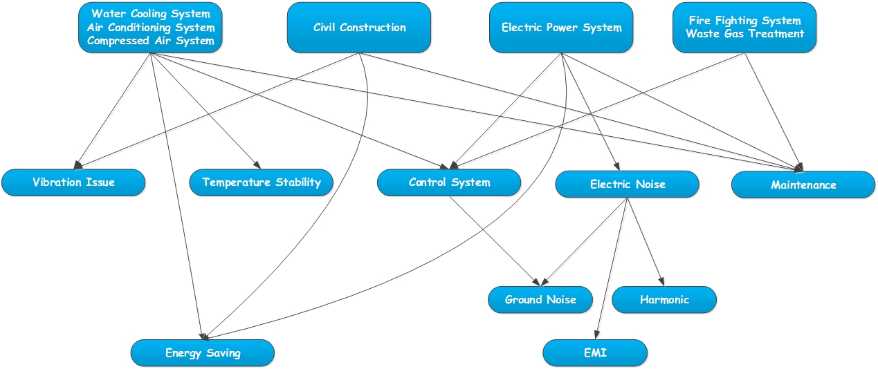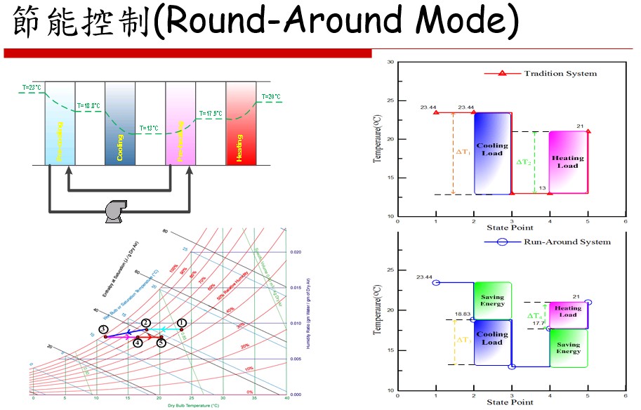 去離子水與空調系統是加速器帶走廢熱轉移至大氣最主要的設施,在這熱傳遞的過程中各設備本身的效率問題與節能管理的機制,影響到全中心最主要的用電量,因此可靠的智慧節能措施必需應用在各設備,其中這些邏輯演算與管理機制得仰賴彈性的監控技術,比如空調箱的run-around,外氣烚值控制,水塔烚值控制,冰機最佳運轉效能,熱泵等控制技術都應用在各個層面上。