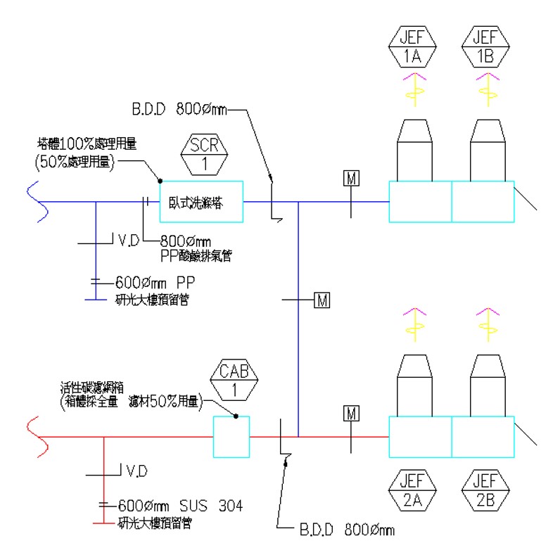 酸鹼排氣採用水洗塔處理,塔體以100%處理量設計,惟營運初期暫以50%處理量運轉,未來若有需求可再擴增。而有機排氣則採用活性碳處理,外箱體採全量設計,惟營運初期活性碳濾材暫以50%處理量設置,未來若有需求可再擴增。