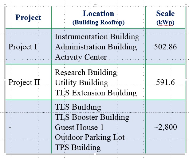 為配合國家之綠能政策發展再生能源系統,規劃於中心各建築物屋頂建置太陽光電發電系統,除可為中心取得發售電之經濟效益,亦期望達到建物遮陽及空調節能之效果,以及美化屋頂視覺及降低屋頂維修之作用。