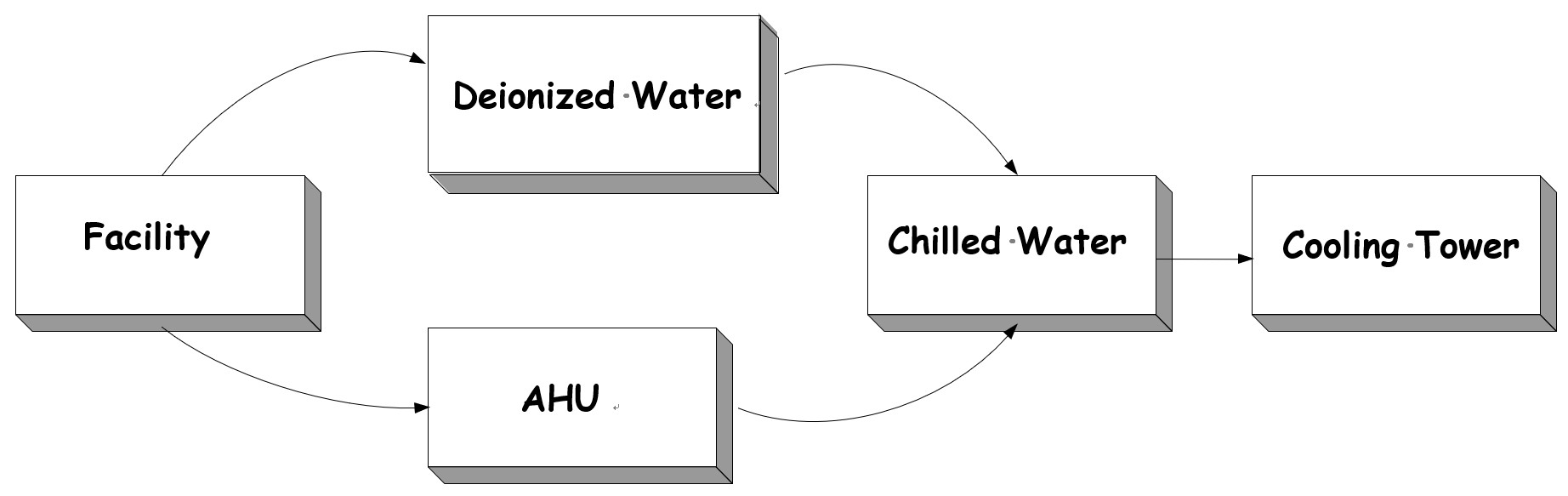本中心實驗空間所產生之熱源不外乎加速器及周邊相關設備所生之顯熱與人員活動產生的潛熱,其熱傳遞如圖2所示。加速器設備的發熱主要由去離子冷卻水帶走(一次熱交換),緊接著與冰水系統之主機或熱水系統之熱泵進行二次熱交換,最後則藉由冷卻水塔與大氣熱交換。