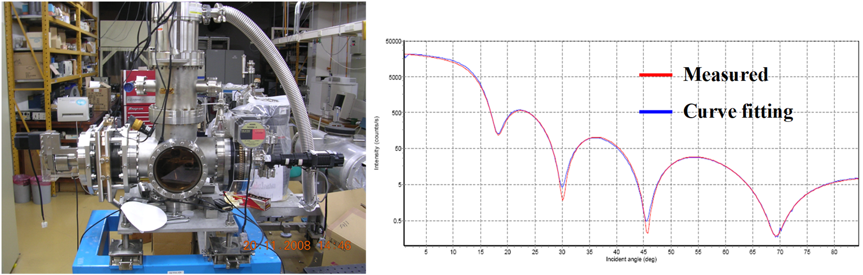 Constructed reflectometer for nkt measurement of the thin films in EUV mask (left). Measured reflection intensity vs. incident angle of EUV light (right).