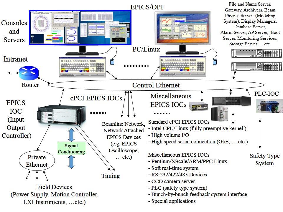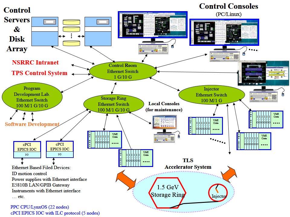 TPS Instrumentation Control system also includes two major parts: Accelerator Control system and Beam Diagnostic system. There are many servers for various function and 300 Input / Output Controller (IOC) in control system as Figure 11. Control software adopts EPICS - Experimental Physics and Industrial Control System framework. The infrastructure is shown as Figure 12. Servers would be served for file storage, database, alarm and etc. as Figure 13. Besides, there are many consoles for easy operation as Figure 13. The control main page as Figure 14 could be provided for clicking to subsystem control.