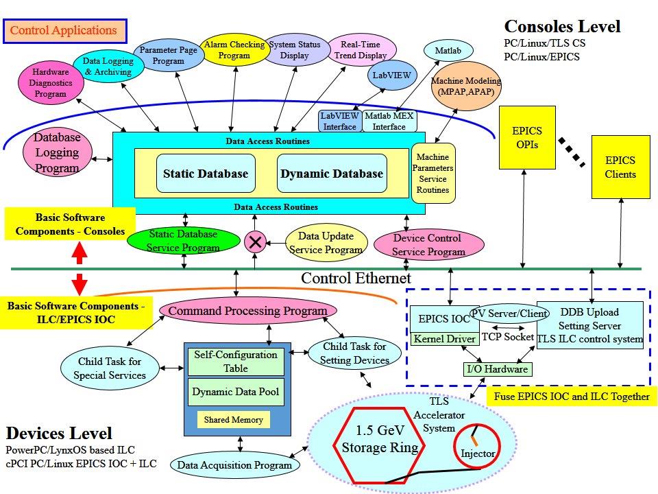 TLS Instrumentation Control system includes two major parts: accelerator control system and beam diagnostic system. Control system adopt distributed hardware and two-level client/server infrastructure (as Fig. 1) to make expansion requirement more feasible. Besides, real-time multi-tasking software infrastructure provide friendly environment for system development (as Fig. 2). In upper client level, there are many various servers and platforms. Control servers would serve for application program, data storage and beam dynamic calculation/simulation; workstations would provide OPI interface, data input/output and GUI display. In lower level, it’s a hybrid system of VME crate based intelligent local controller (ILC) and EPICS (Experimental Physics and Industrial Control System) IOC (Input / Output Controller) which would be responsible for subsystem controls and monitoring. Client and IOCs would be connected with 100 M/1G/10G Ethernet for communication. All data from all ILC and EPICS IOC would synchronized updated at 10 Hz up to the database of the upper servers/platforms and accessible for diverse application program includes operator interface (OPI) of subsystem, functional OPI, startup/shutdown process, archive, alarm system, specific computer procedure, beam dynamic AP and etc.