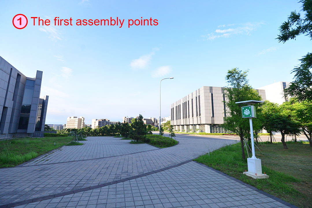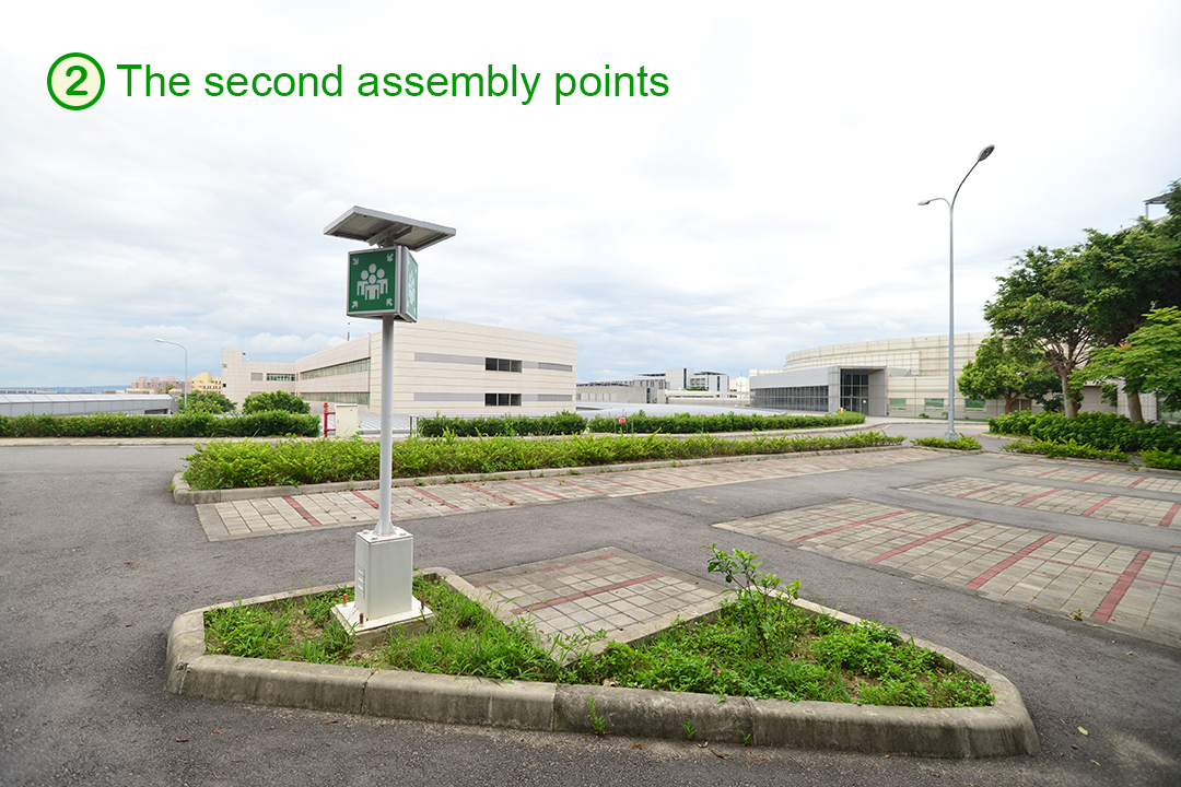 When evacuation is required in the event of an emergency in the NSRRC, please go to the nearest assembly points to facilitate the personnel's inventory and follow-up contingency measures. The first assembly points is located in the front turf of gate No. 2, the exit of the Administration Building, and the second assembly points is located in the turf outside of the Instrumentation Building.