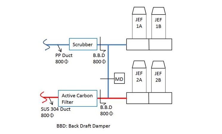 The acid/alkaline gas stream is removed with scrubber, Fig. 15. The scrubber is designed to have 100% handling capacity. Also, the organic exhaust is handled and removed with active charcoal. At present, both systems operate with only 50% capacity. They could be increased in the future depending on its needs.