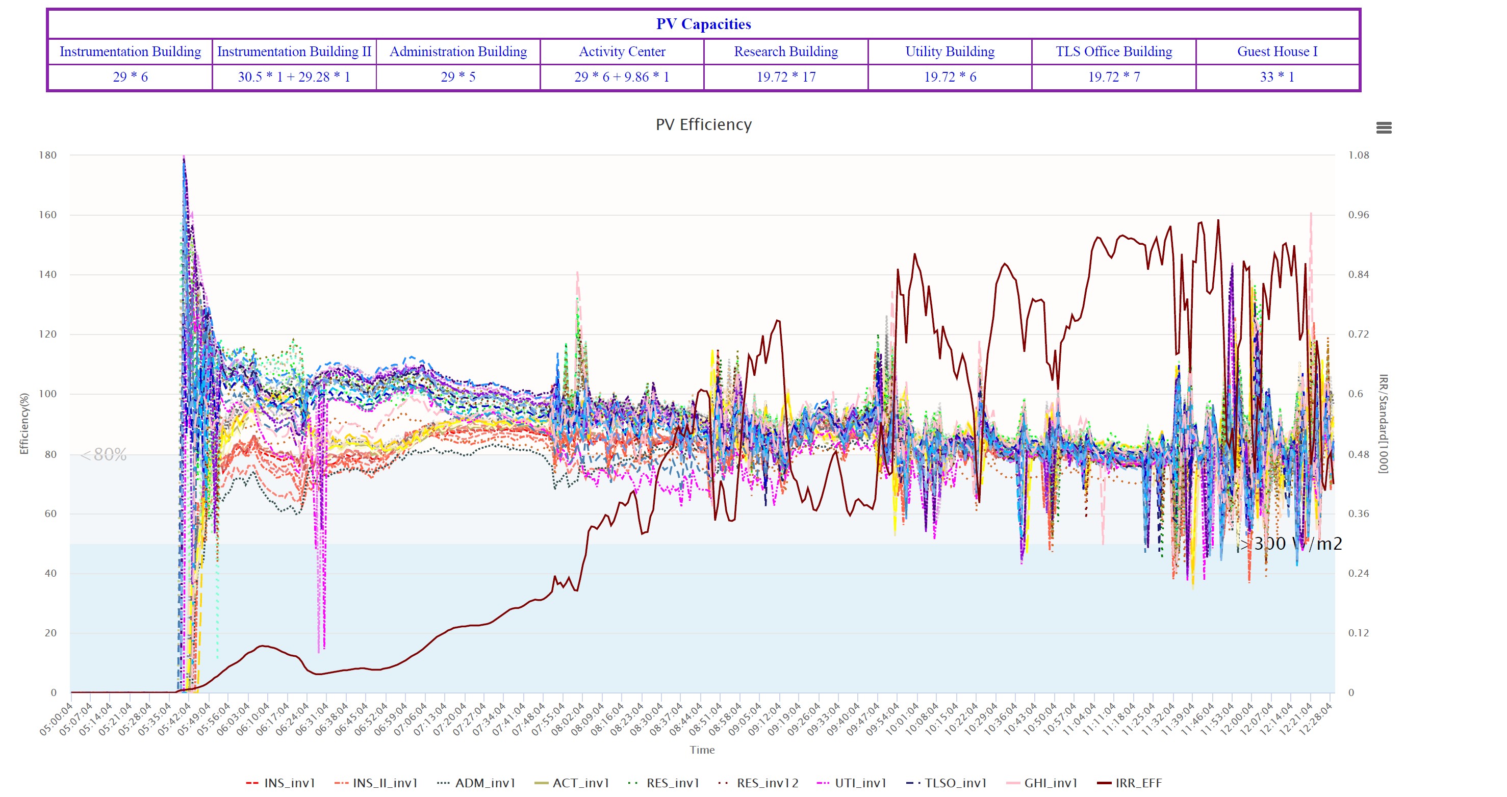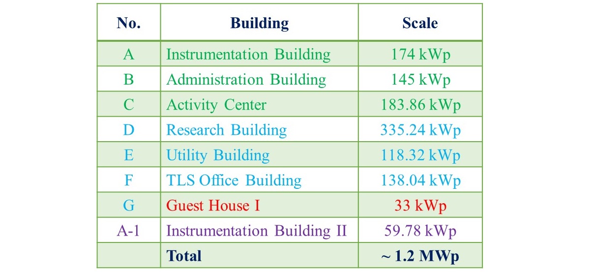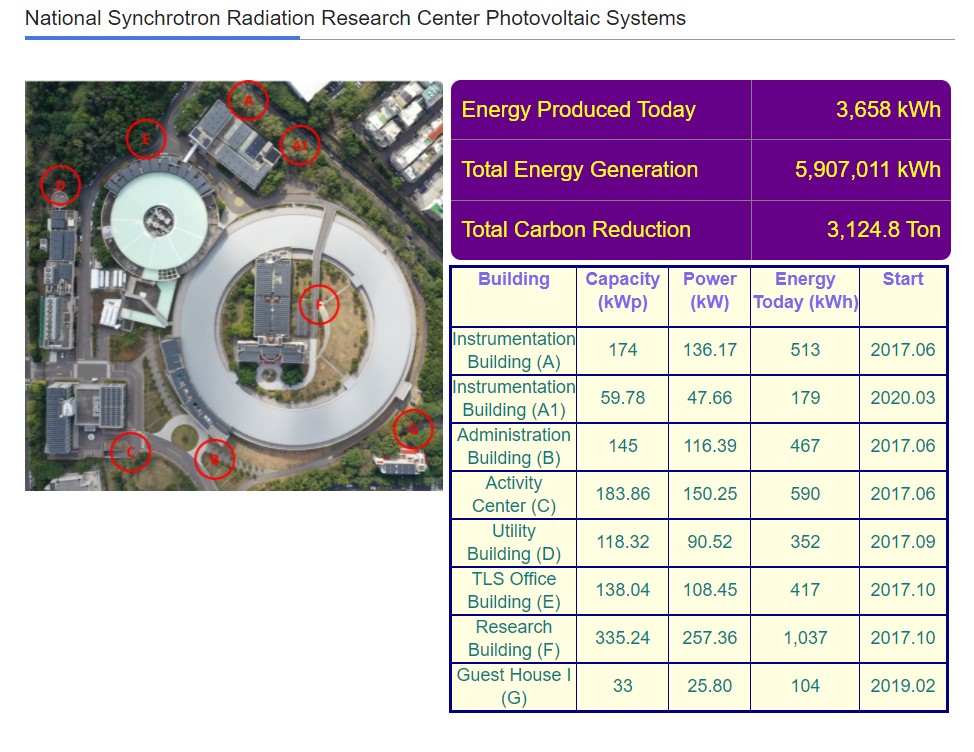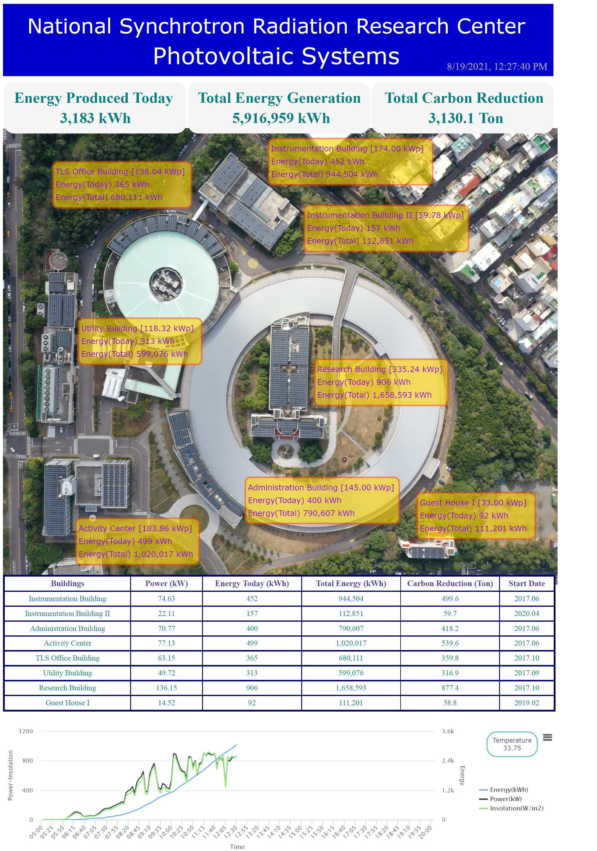In order to support the Taiwan Green Energy Policies about energy saving and carbon reduction, NSRRC has constructed a Green Power Generation System. The Photovoltaic (PV) system has been built on the roof of several buildings at NSRRC site, Fig. 18, Fig. 19 and Fig. 20. This rooftop PV system is helpful in saving air conditioning consumption because it can reduce the direct sunlight and lower the building interior temperature. Besides, it can also reduce the damage of waterproof materials in the roof caused by solarization and cut down the repair works and expenses. Moreover, the energy generated by the photovoltaic system can be delivered to the Taiwan Power Company to earn a financial benefit. A data collection platform for this photovoltaic system has also been set up to monitor the PV energy generation and its related information. The acquired data can be analyzed to further improve the solar energy supply system of NSRRC.