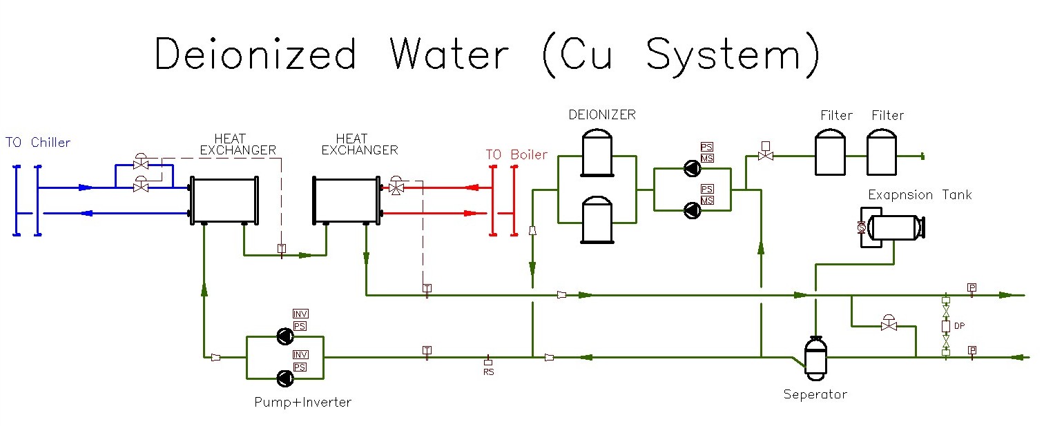 In order to minimize the thermal deformation and higher stability of components of subsystems of TPS accelerator, the water pressure of the de-ionized water must be kept within 7.5±0.1 kg, and the water temperature must also be maintained within 25±0.01 oC. The schematic diagram for de-ionized water system is shown in Fig. 3. The green line is the de-ionized water. The higher temperature water after passing the components which has been cooled will pass the steam separator to separate the steam and water. Then, 5% of the returned water will enter the mixed bed exchanger to undergo water treatment and return back to the water return pipe. All the returned water will be pressurized by pump, so it can circulate in the pipe. Thereafter, the water will pass through two heat exchangers, one for cooling with 7.0 ℃ chilled water (blue color) and another for heating with 50 ℃ hot water (red color). Then, the water will flow to each subsystem again. When the water level is too low, the water can be replenished according to the water level gauge in the expansion tank. The replenished water comes from the reverse osmosis water storage tank and passes through regenerative pump, then, flows back to the return pipe. In order to achieve a higher precision temperature control, another mixed flow tank is added in to fine tune. After this improvement, the fluctuation of temperature can reach ±0.01 ℃. To those devices which require a high precision temperature control, this design can reduce the thermal disturbance to a minimum.