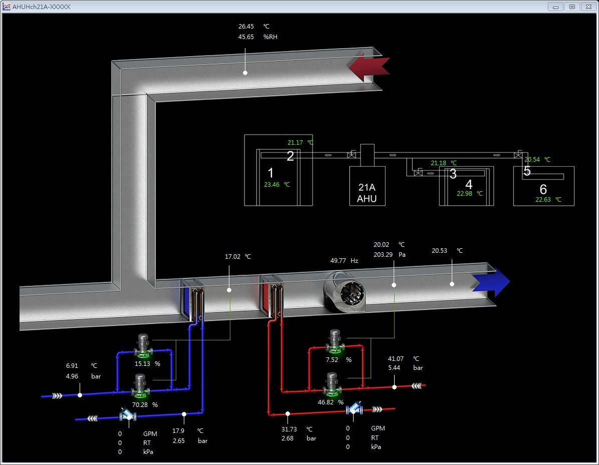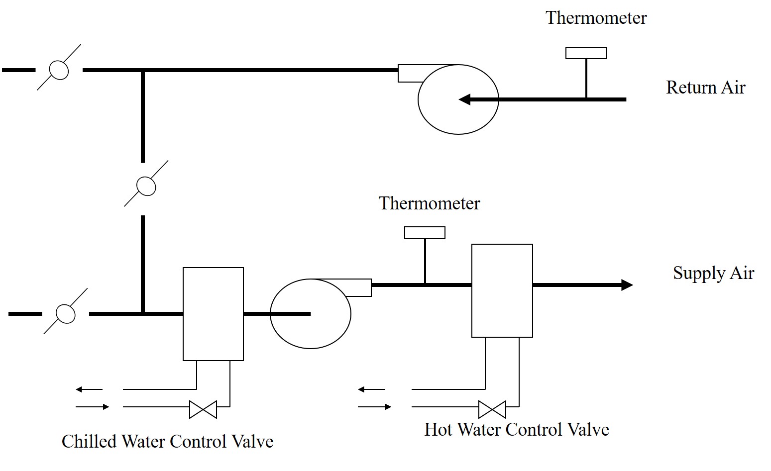 The central air conditioning system is the primary air conditioning system in NSRRC. The air handling units are used to regulate and circulate air. Fig. 4 shows a simple configuration of air circulation design. After the air returned from the supplied area and mixed with the outside air, it exchanges heat with the chilled water heat exchanger. In this stage, the chilled water control valve controls the heat exchange quantity. Then, the temperature of air will be cooled down to the setting temperature and the relative humidity approaches saturation. Thereafter, the air will perform heat exchange in the hot water heat exchanger before it enters the air condition supply area. The hot water control valve controls the quantity of heat added which enable the quality of air delivered attaining the preset temperature and humidity.