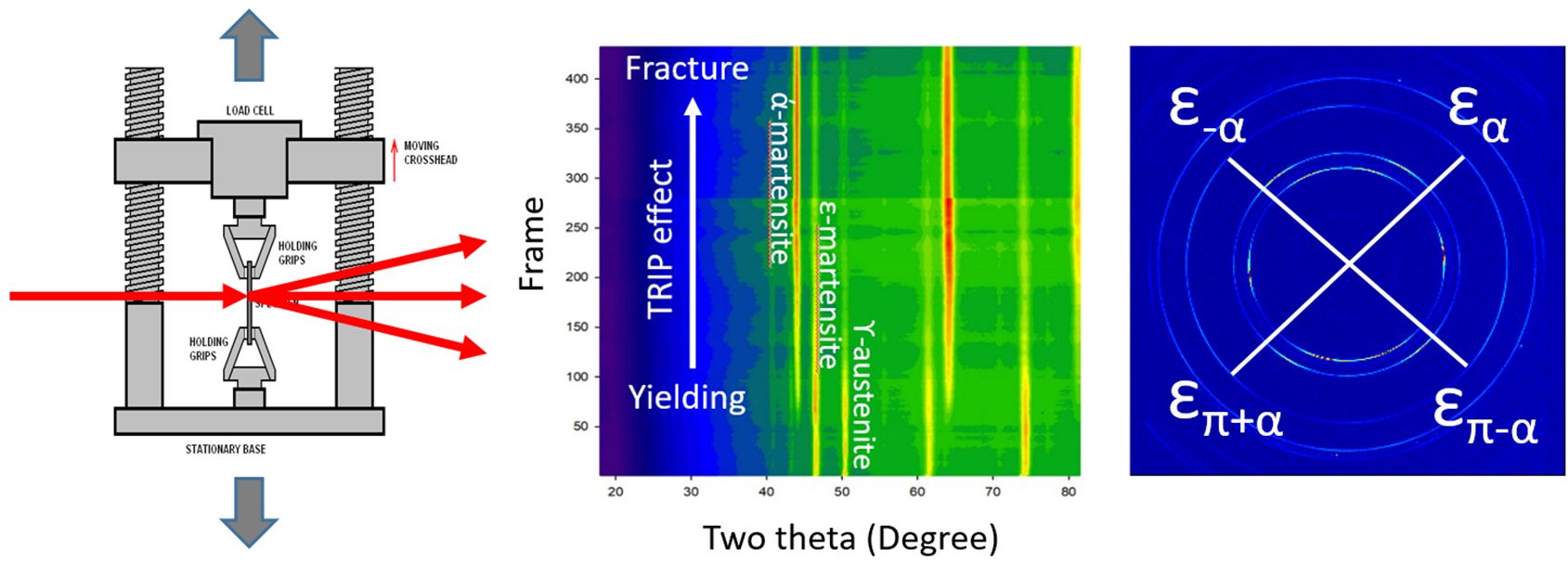 In-situ tensile x-ray diffraction measurement (left and central) and residual stress measurement (right) are used for controls of strength, plasticity, and dimensional stability of alloys. These information are very valuable to develop advanced steel materials with excellent static/dynamic mechanical properties.