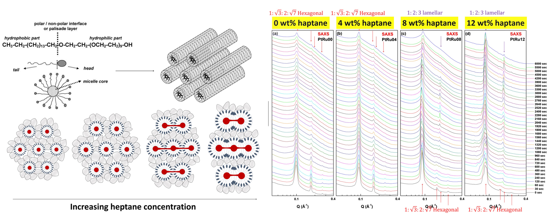 On the basis of in situ SAXS/WAXS (top right), complementary with XANES and EXAFS (bottom) results, the comprehensive structural evolution and variation of valence were constructed. The SR techniques provide insight into the development of catalyst materials with large pore volumes, large internal surface areas, specific pore structures, and high performance.